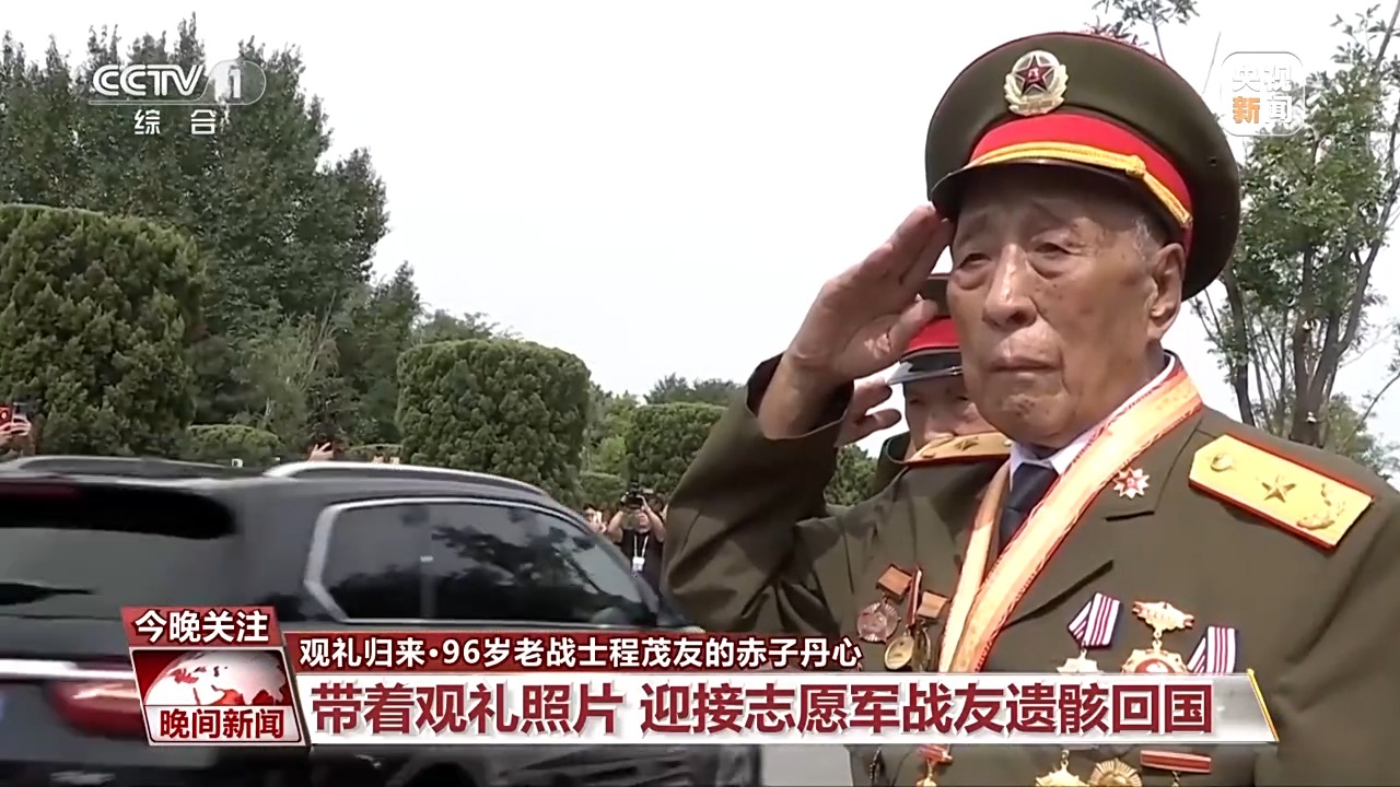 观礼归来,程茂友便带着激动的心情迎接战友回家。9月12日,第十二批30位在韩中国人民志愿军烈士遗骸回到祖国。在沈阳抗美援朝烈士陵园的大门前,程茂友早早地就来迎接战友们回家。程茂友还特意带来了在阅兵式上的观礼照片,他要亲自把美丽祖国的发展变化讲给战友们听。